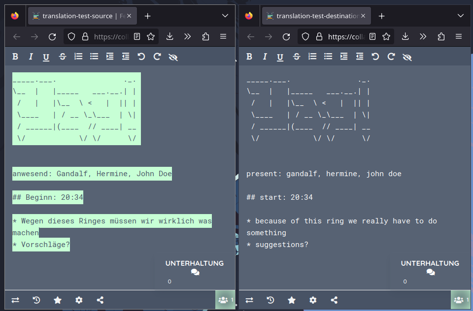 Sometimes you might participate in meetings where a transcript is written in real-time by a human using a collaborative note-taking tool e.g. HedgeDoc or EtherPad. A single collaborative document written using such a tool is called pad. It then could be possible that you want to have the protocol translated into different languages. One possible reason is that there are participants that would like to read the protocol in real-time in another language than the one the protocol is written in.